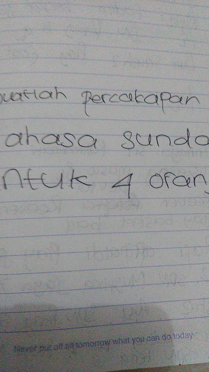 Kali ini admin menulis contoh dialog bahasa sunda 2 orang singkat. Contoh dialog drama 6 orang percakapan dalam bahasa sunda percakapan l, percakapan bahasa inggris 2 orang, contoh percakapan bahasa indonesia,,,,,. Paguneman adalah naskah percakapan dua arah, baik 2 orang ataupun lebih, dimana terjadi . Percakapan bahasa sunda 2 orang dan artinya. Contoh percakapan dalam bahasa sunda yang isinya tentang permintaan. Daftar isi hide 1 percakapan bahasa sunda dan artinya 2 percakapan bahasa sunda sehari sehari 2.1 dialog menjenguk teman yang sakit Melakukan percakapan dengan orang tua atau orang yang kita hormati, . Contoh dialog perkenalan 2 orang bahasa sunda lemes dengan teman baru di sekolah. Jika orang yang baru kenal, umurnya lebih tua, atau kedudukannya lebih tinggi, kita gunakana bahasa halus (lemes). Drama perkenalan 5 orang 3 bahasa. Contoh percakapan bahasa sunda yang .